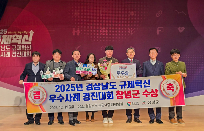 창녕군은 지난 19일 열린 경상남도 주관 「2025년 경상남도 규제혁신 우수사례 경진대회」에서 지역경제활력 제고 분야 우수사례로 우수상을 받았다.